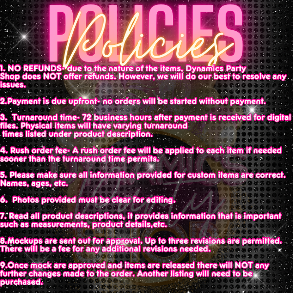 By purchasing you are agreeing to Dynamics Party Shop LLC policies and terms & conditions.